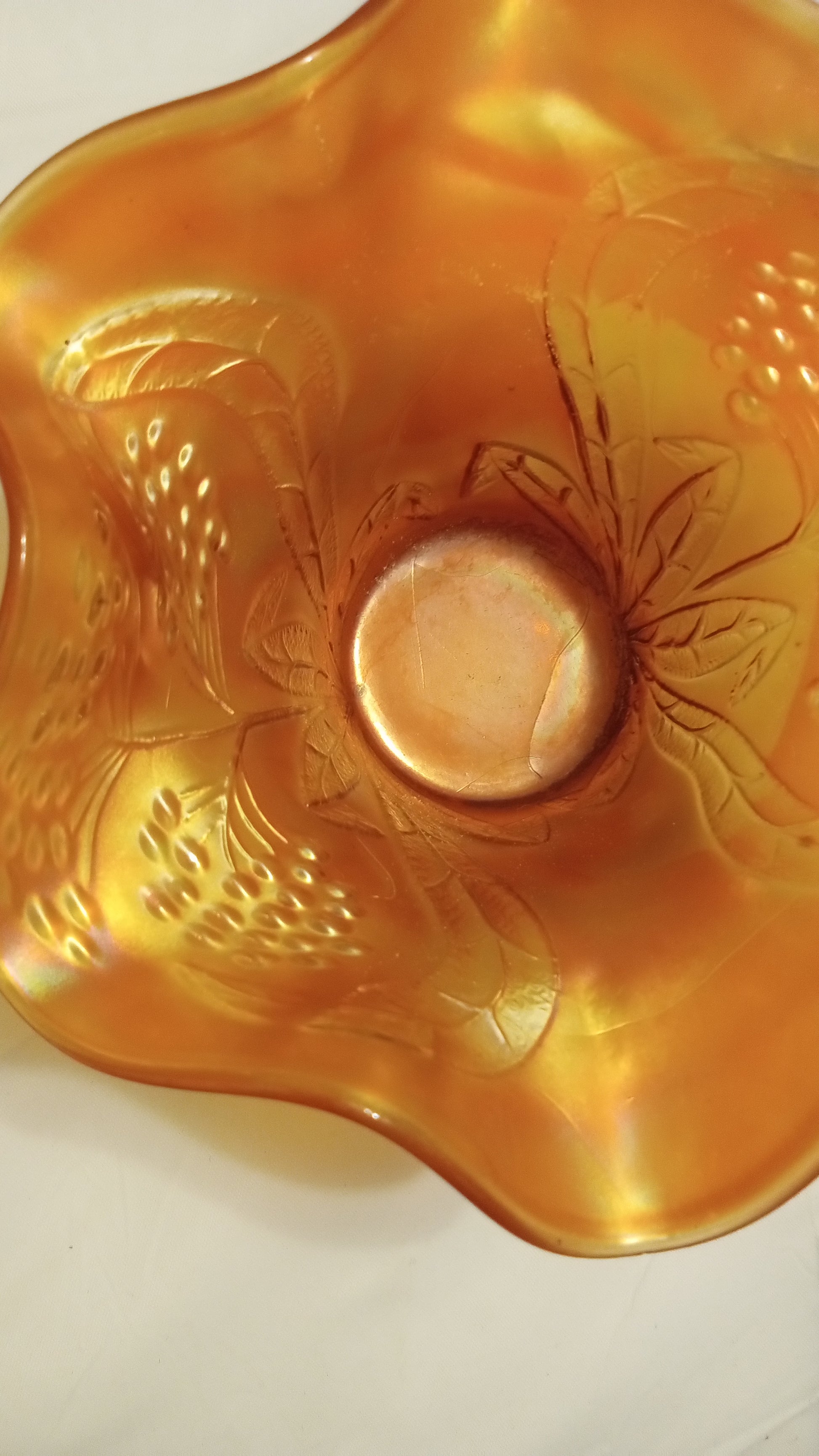 Its iconic Marigold (a rich, iridescent orange) hue catches the light beautifully, illuminating the deep, classic Grape and Cable pattern, a favorite originally produced by companies like Fenton and Northwood. The stunning 6-inch ruffled edge makes it a perfect size for a decorative accent, or for holding jewelry, nuts, or candy.