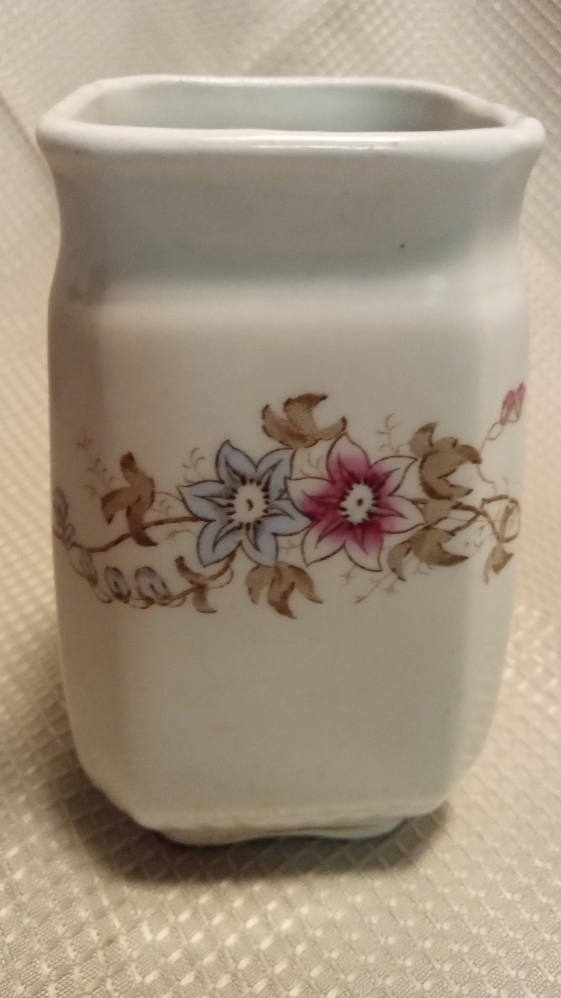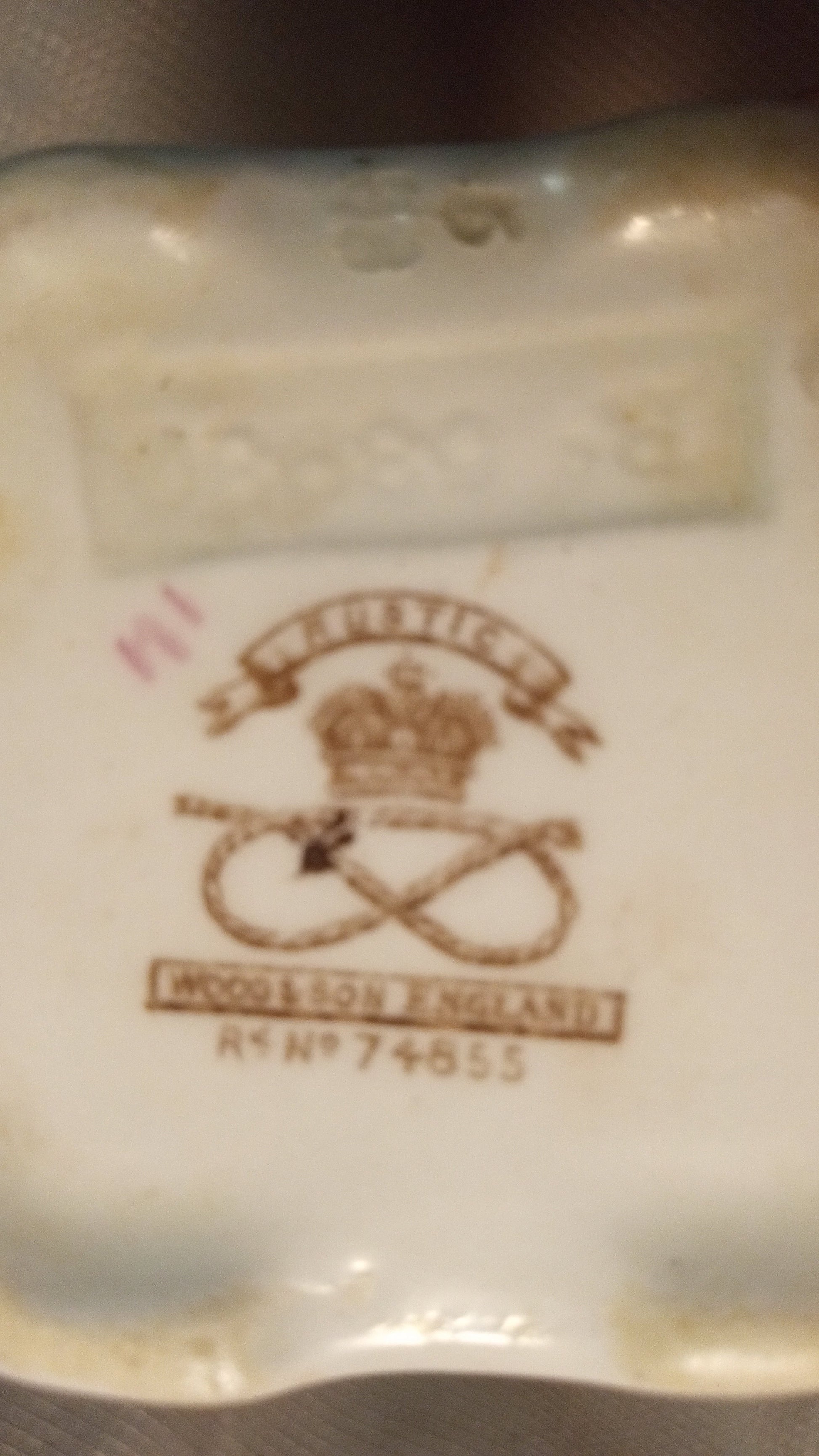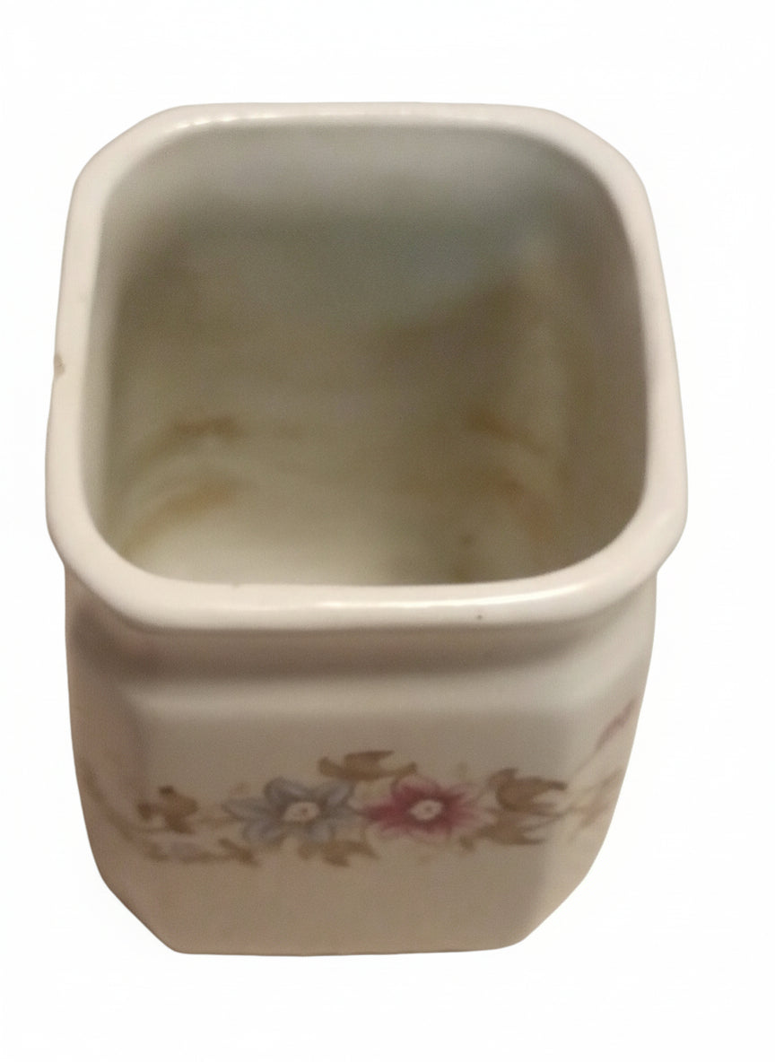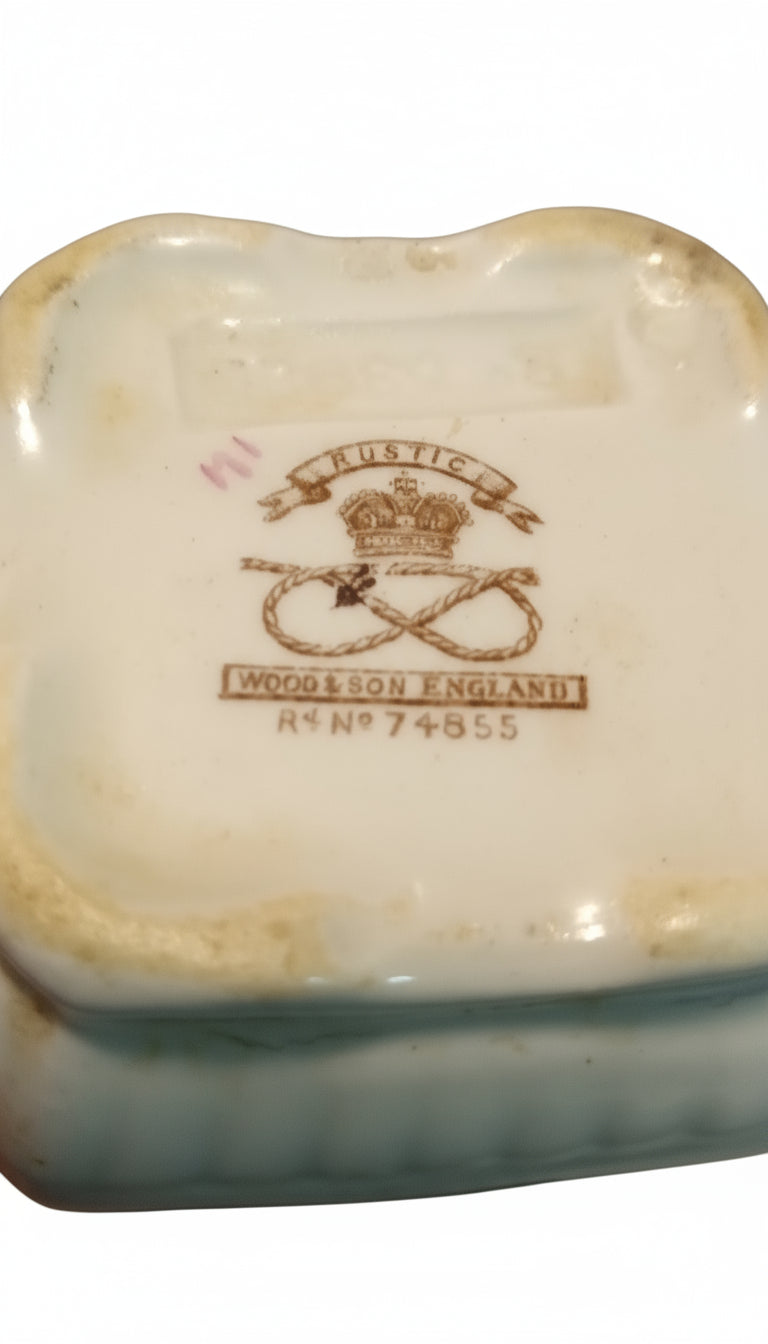 Crafted by the renowned Wood & Son England in Burslem, this small utility vessel is decorated in the rare "Rustic" pattern, featuring a delicate band of colored and brown florals. These small, sturdy pieces were hardworking items in the late 19th-century kitchen, often used as an open sugar scuttle, a spill vase for matches, or a small brush pot.